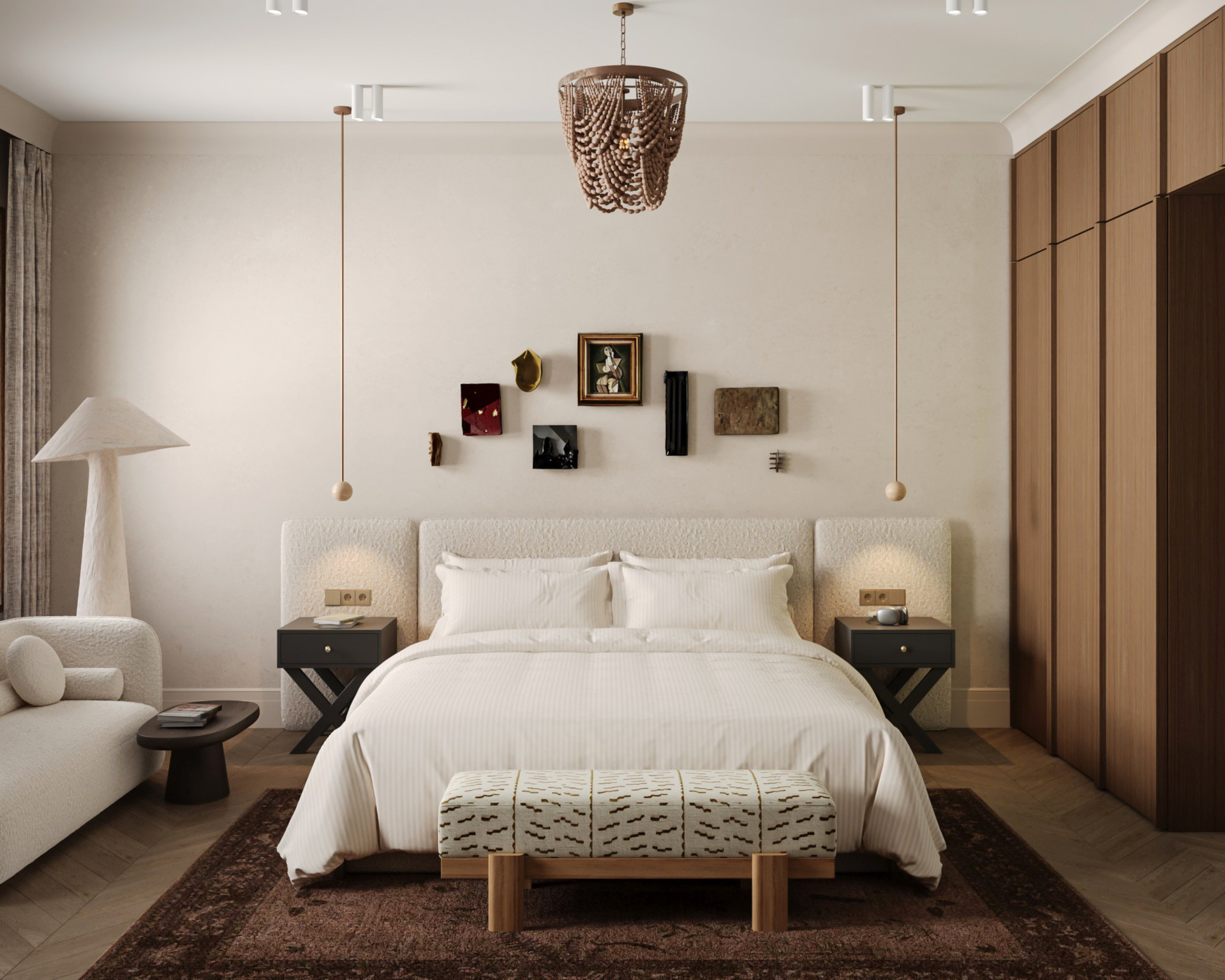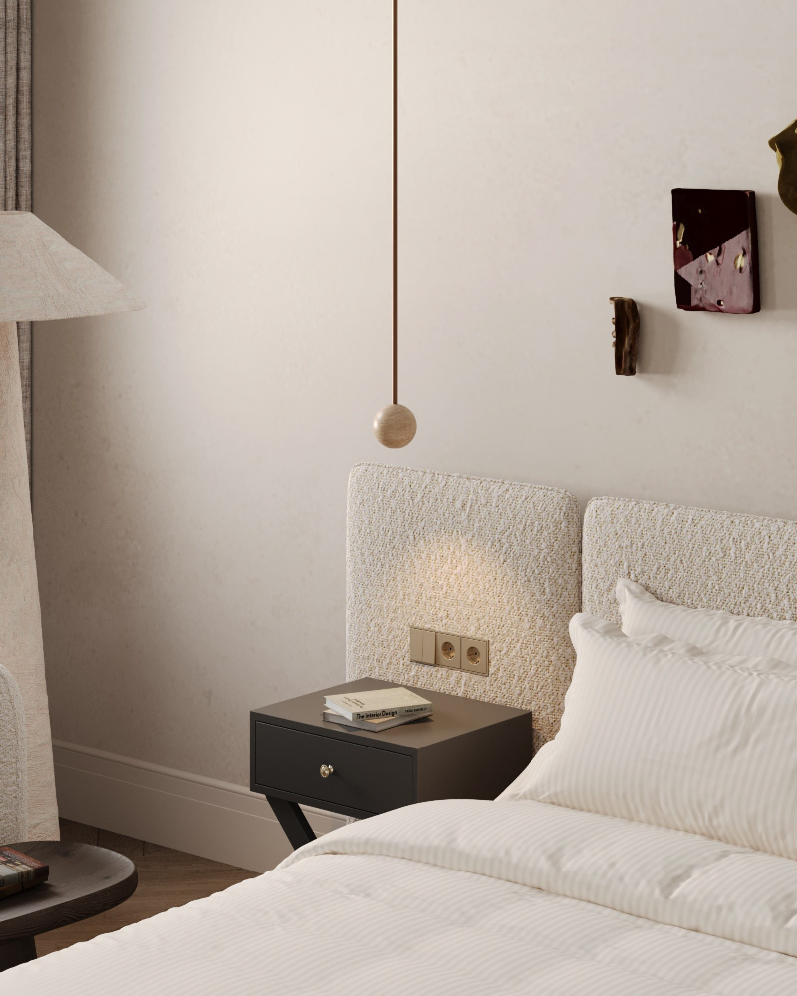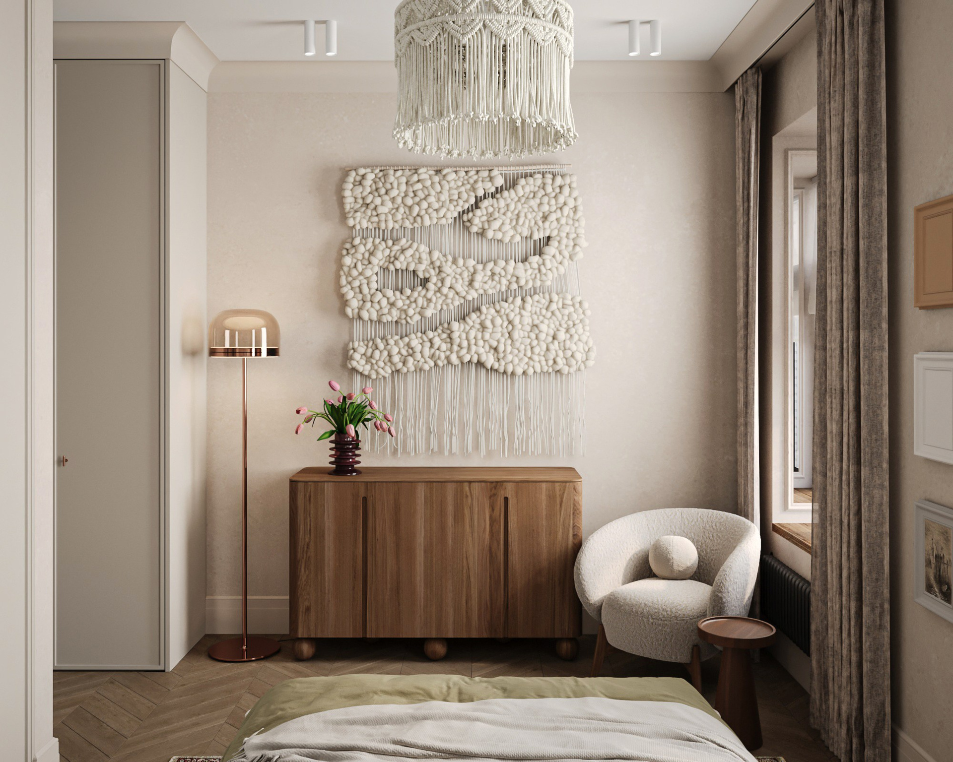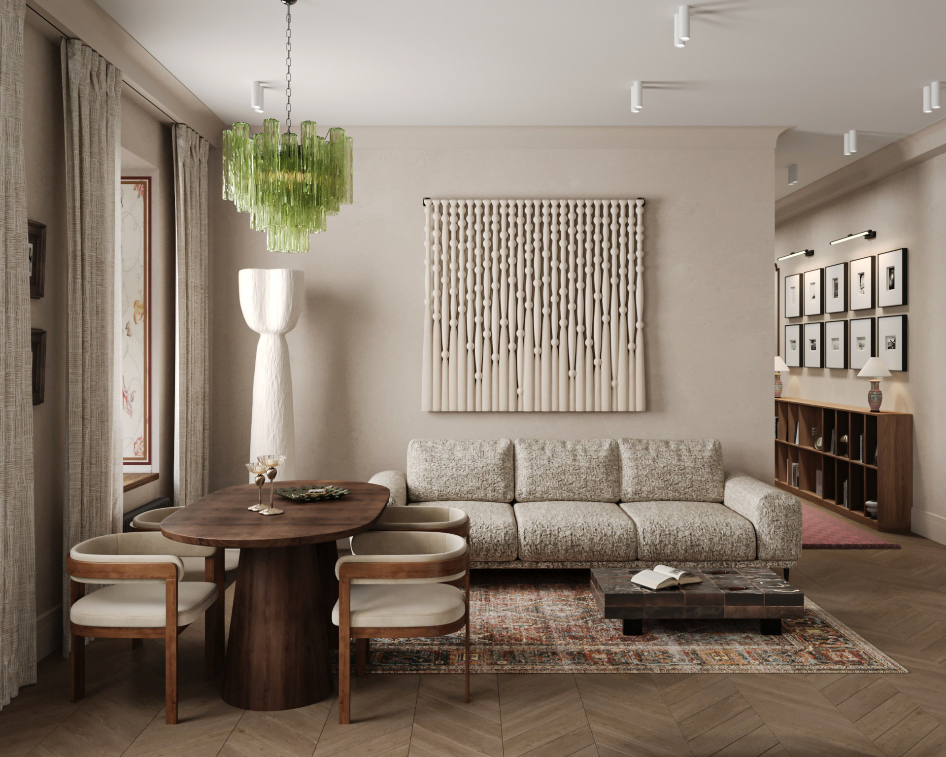При этом архитектура остается сдержанной и выверенной. Спокойная база — мягкие оттенки, натуральные материалы, тактильные поверхности — создает фон, на котором раскрываются предметы. Свет, текстиль, фактуры работают вместе, формируя многослойную, но не перегруженную среду. Этот интерьер не про быстрые решения — он про ощущение дома, который собирается со временем: через вещи, к которым есть личное отношение, через детали, которые хочется рассматривать, и через пространство, в котором комфортно жить.