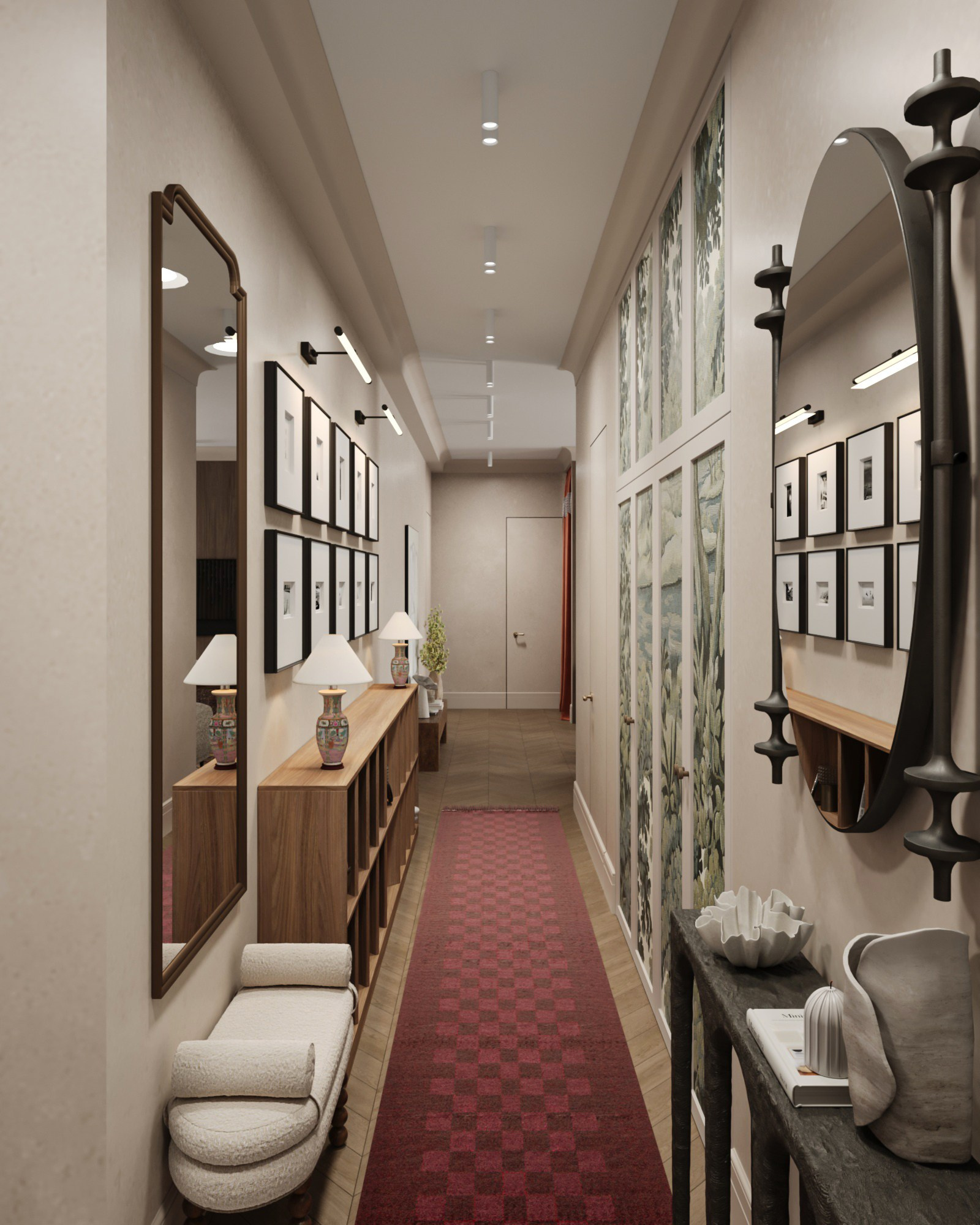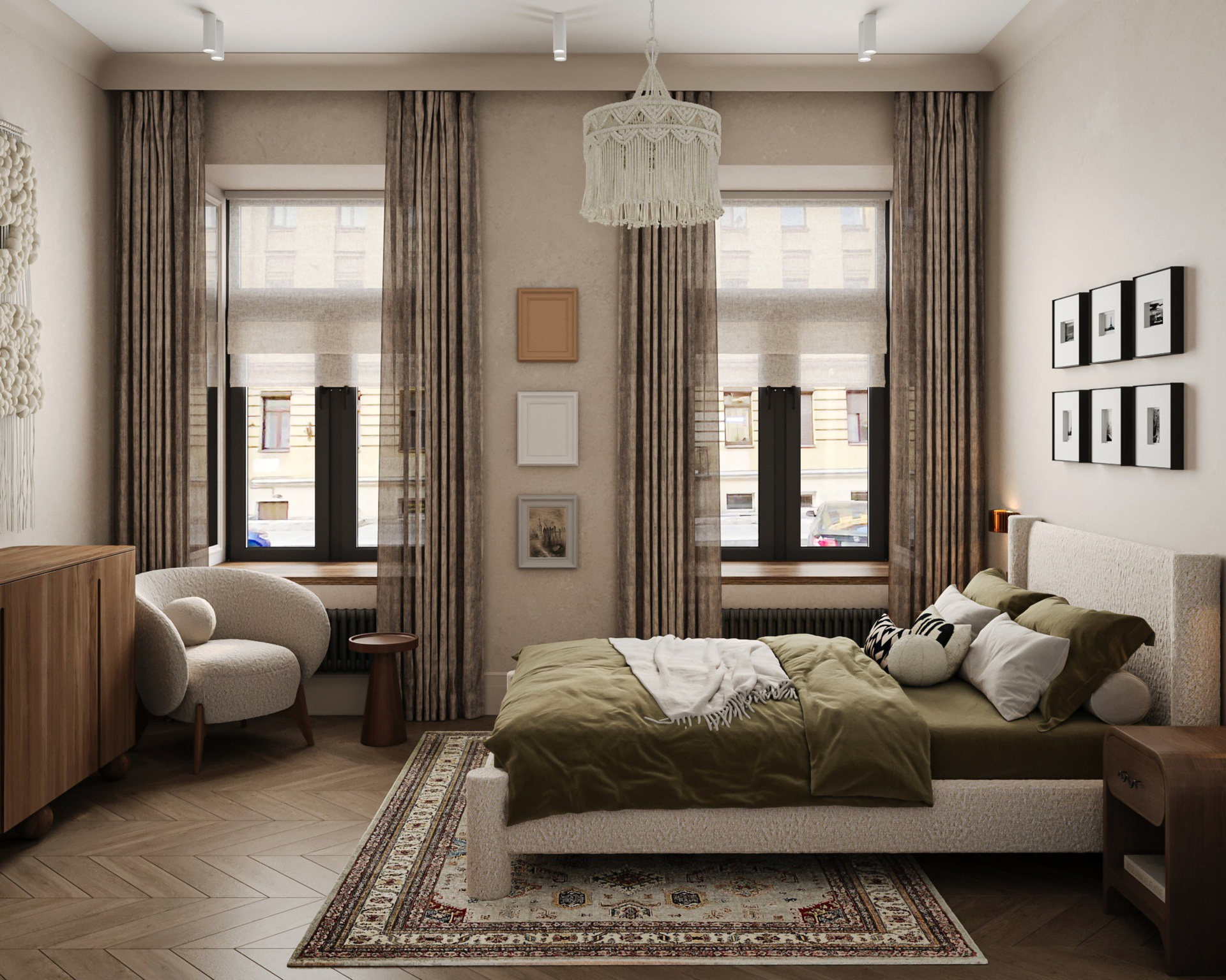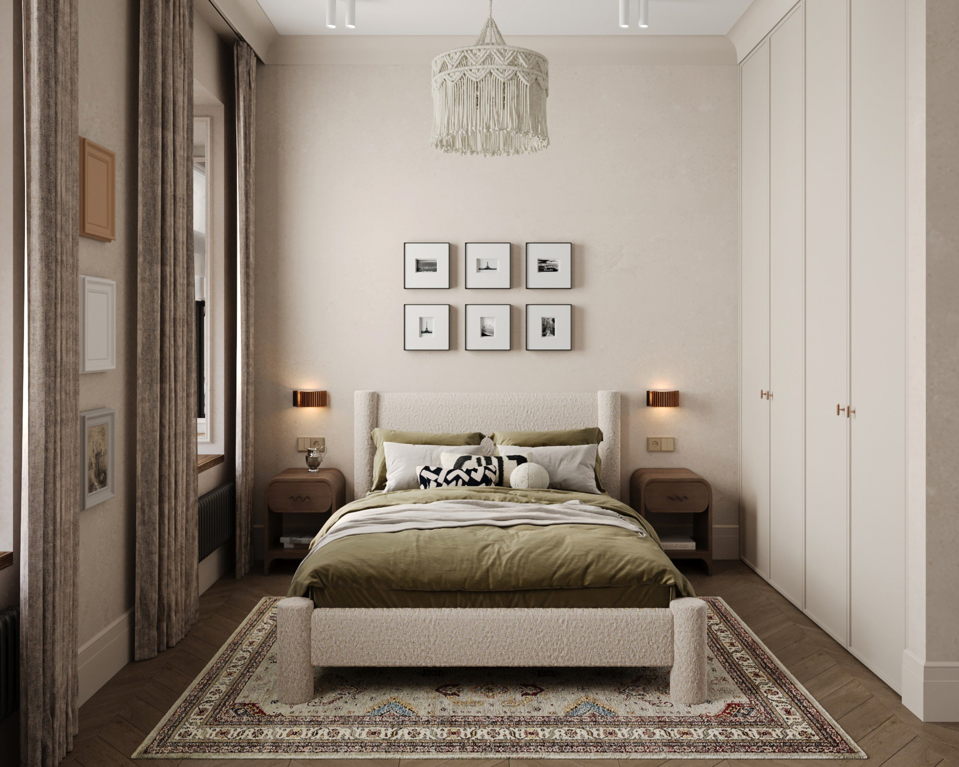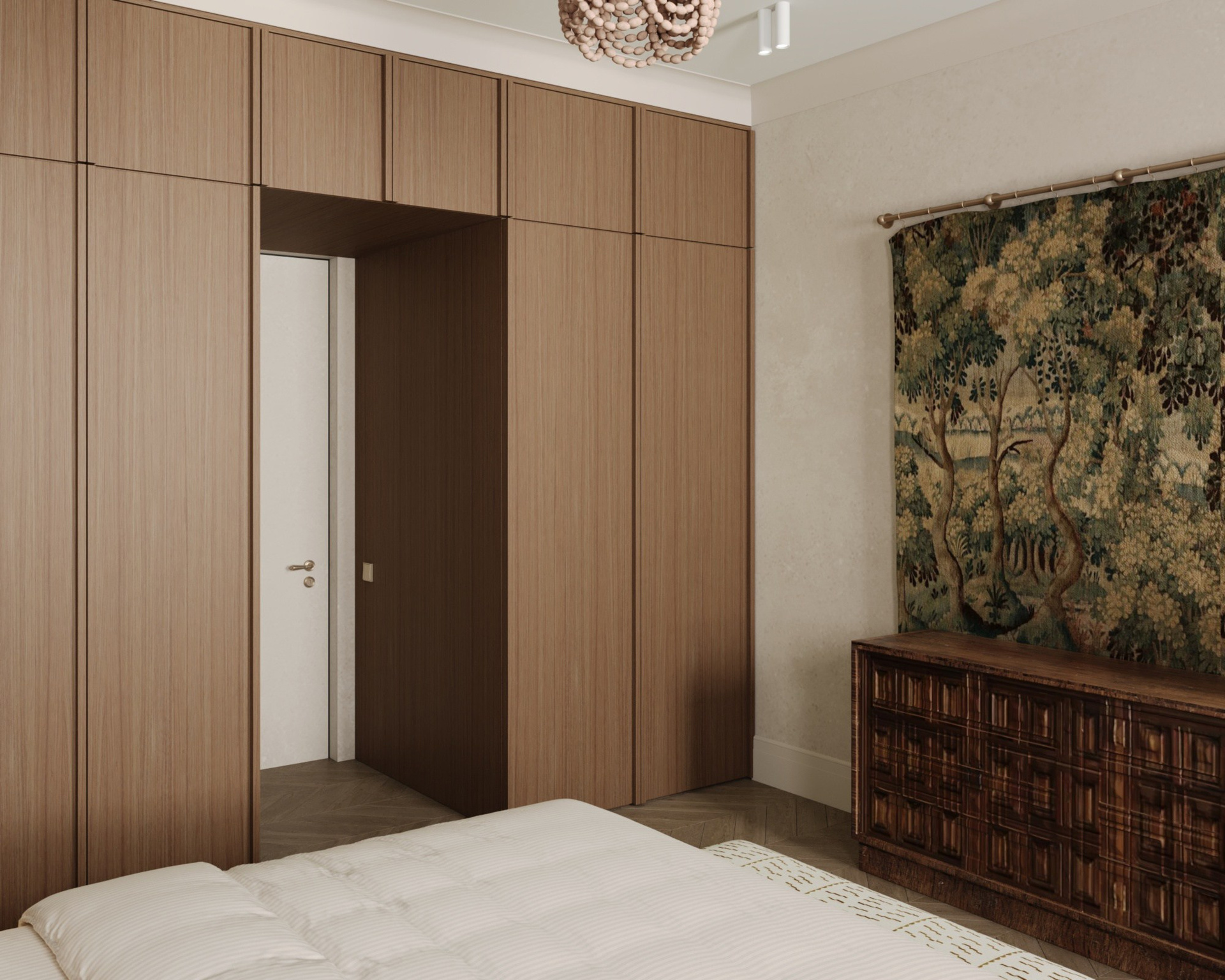 При этом архитектура остается сдержанной и выверенной. Спокойная база — мягкие оттенки, натуральные материалы, тактильные поверхности — создает фон, на котором раскрываются предметы. Свет, текстиль, фактуры работают вместе, формируя многослойную, но не перегруженную среду. Этот интерьер не про быстрые решения — он про ощущение дома, который собирается со временем: через вещи, к которым есть личное отношение, через детали, которые хочется рассматривать, и через пространство, в котором комфортно жить.