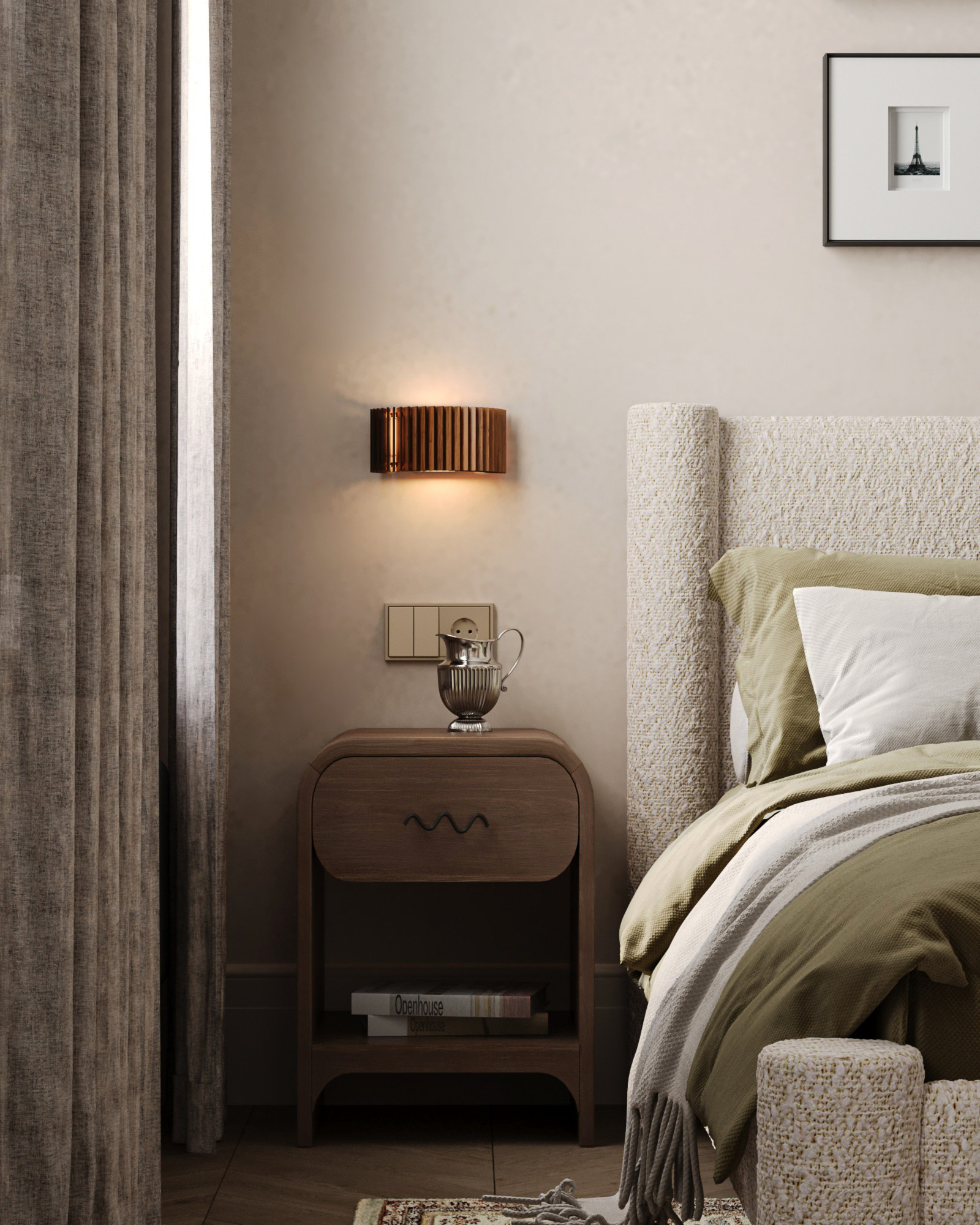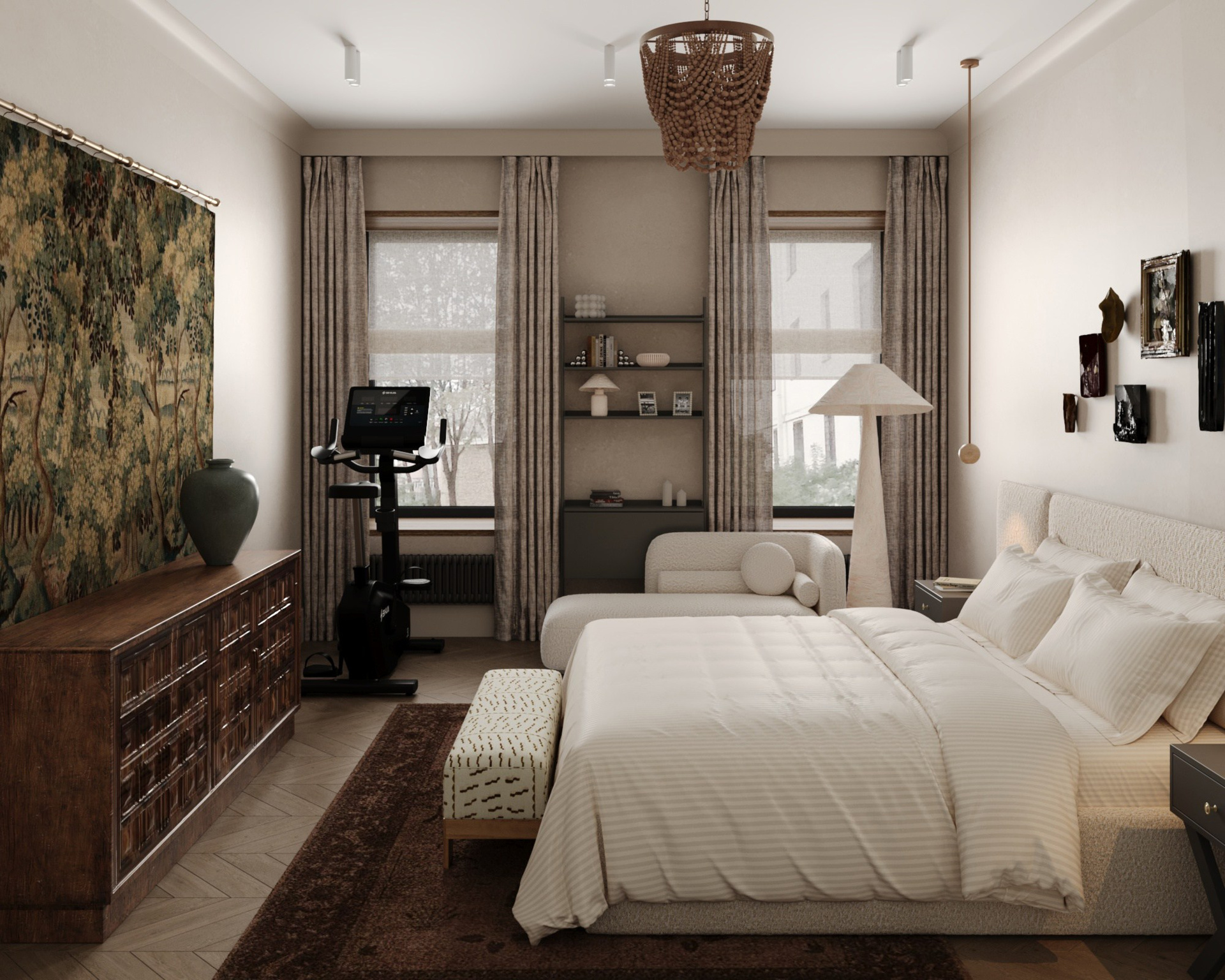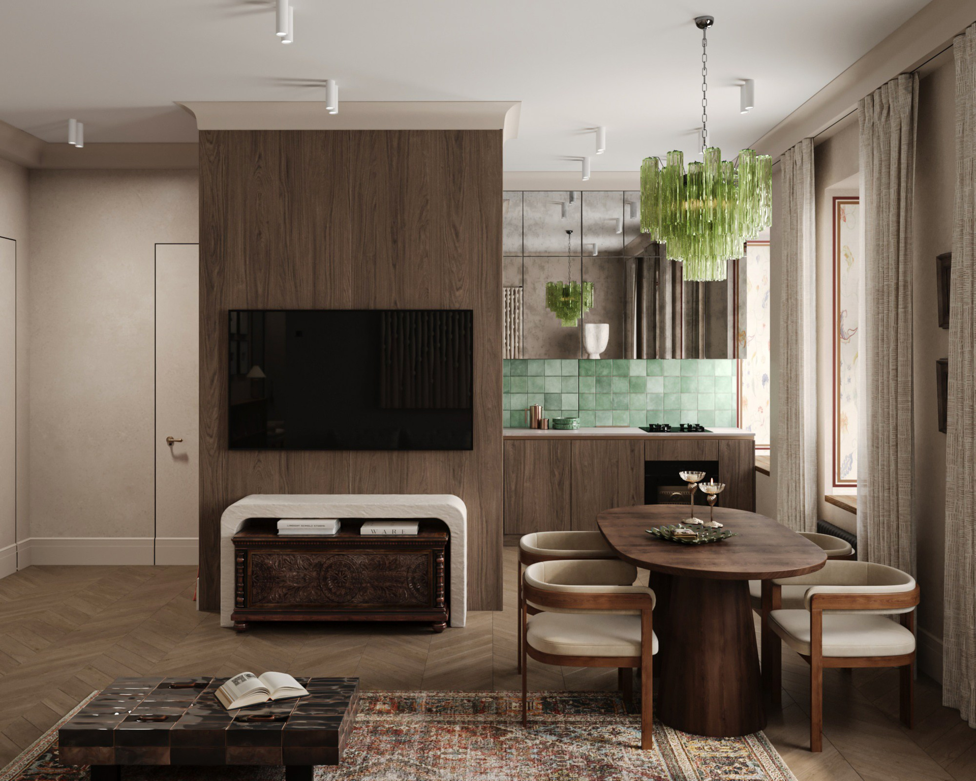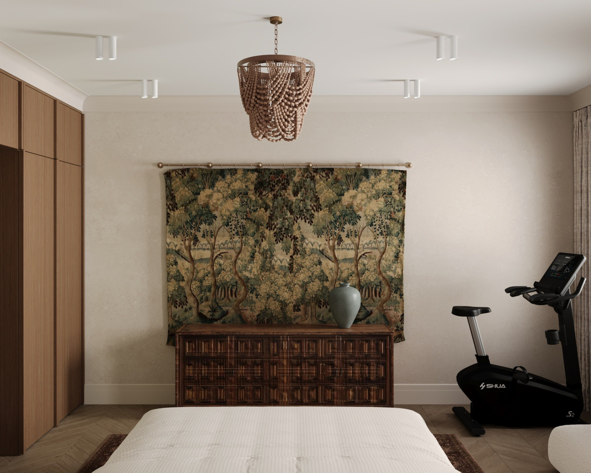 При этом архитектура остается сдержанной и выверенной. Спокойная база — мягкие оттенки, натуральные материалы, тактильные поверхности — создает фон, на котором раскрываются предметы. Свет, текстиль, фактуры работают вместе, формируя многослойную, но не перегруженную среду. Этот интерьер не про быстрые решения — он про ощущение дома, который собирается со временем: через вещи, к которым есть личное отношение, через детали, которые хочется рассматривать, и через пространство, в котором комфортно жить.